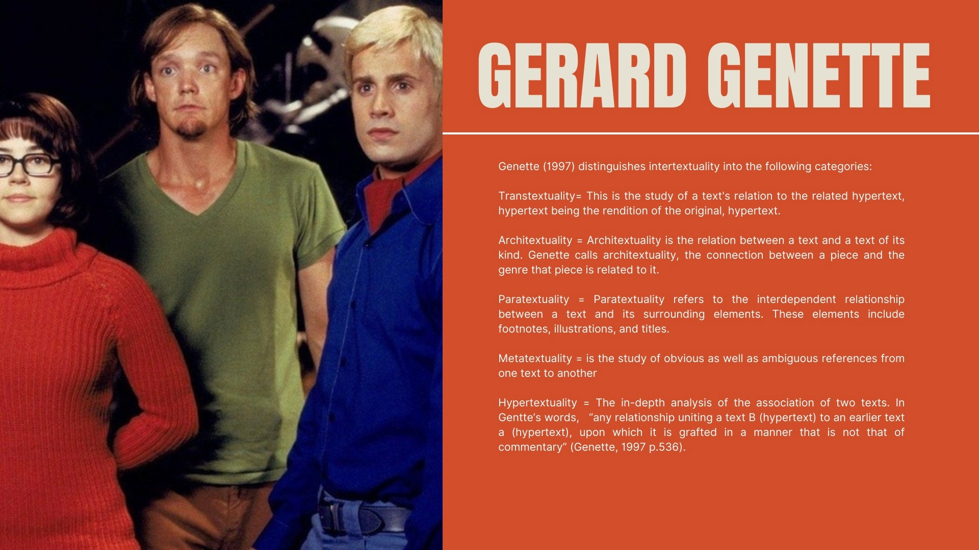 "Genette's approach has demonstrated its efficacy in examining both overt and covert allusions in texts. Additionally, it enables a thorough examination of the diverse intricacies of textual referencing. Nevertheless, Alfaro's claim that "the five categories of Genette tend to overlap when it comes to practice" (1996, p.281) is somewhat accurate, as certain terms display only minor variations when scrutinizing distinct forms of intertextuality in the context of the Scooby Doo text."