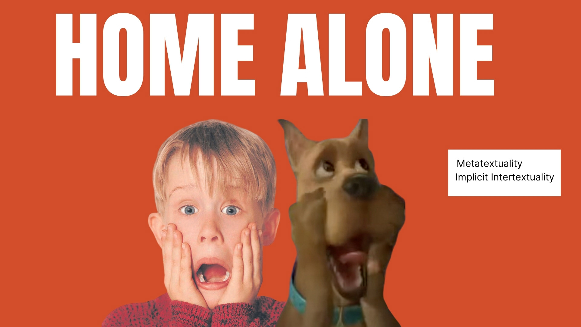 "Within this instance of metatextuality, Scooby Doo mimics the actions of Kevin from Home Alone, which serves as the original hypotext. This is an implicit example of intertextuality, given that the action is replicated without any explicit reference to Home Alone, in contrast to Shaggy's Star Wars reference. Although brief, the homage to Home Alone enriches Scooby's character. From this action, we can deduce that Scooby is depicted as childlike, akin to Kevin. This is further corroborated by his other attributes, such as his fondness for Scooby snacks and his lack of impulse control. By establishing similarities between Scooby's character and well-known child figure Kevin, our perception of Scooby as the most innocent member of the group is strengthened."