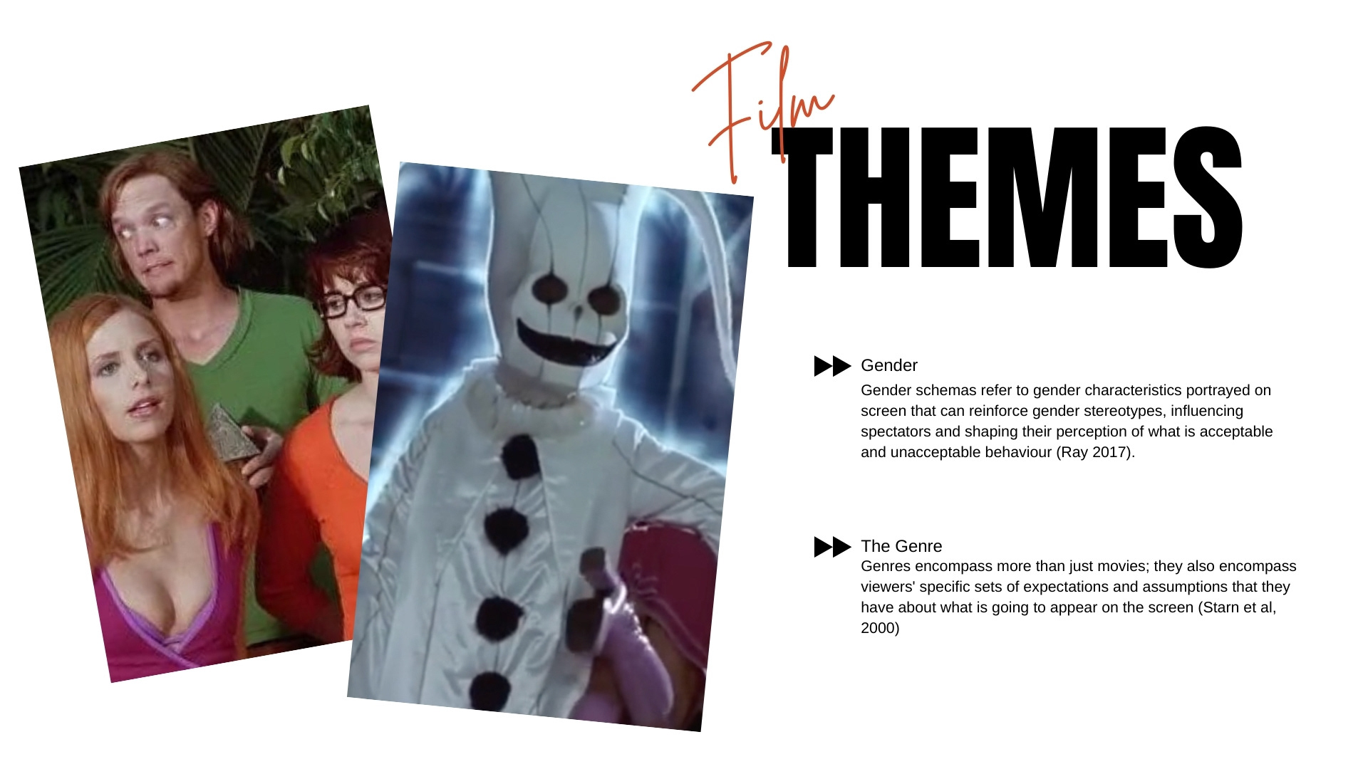 "Genre: These expectations and assumptions interact with the films during the screening, enabling audiences to comprehend and rationalize the films and their elements. Therefore, these expectations and assumptions involve understanding various plausibility, motivation, justification, and belief systems. In this sense, Gunn followed the comedic genre, incorporating classic characteristics such as slapstick humour and comedic moments from other films, alas using intertextuality to aid the hilarity of his film."