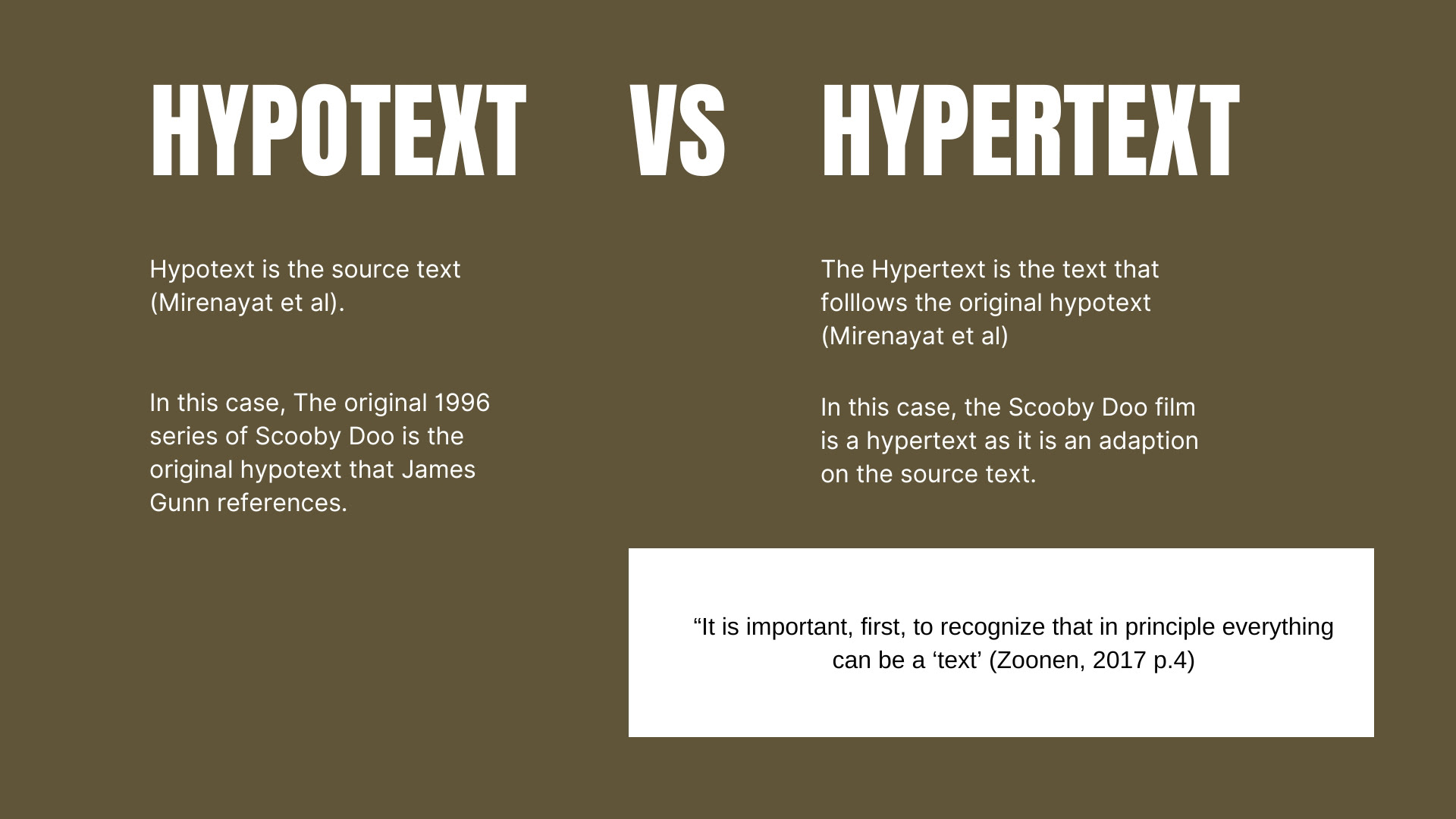 "In terms of architextuality, Buffy the Vampire Slayer and Scooby-Doo have many of the same attributes as they are from the same genre. In Buffy the Vampire Slayer, Buffy and her gang also solve mysteries like in Scooby Doo."